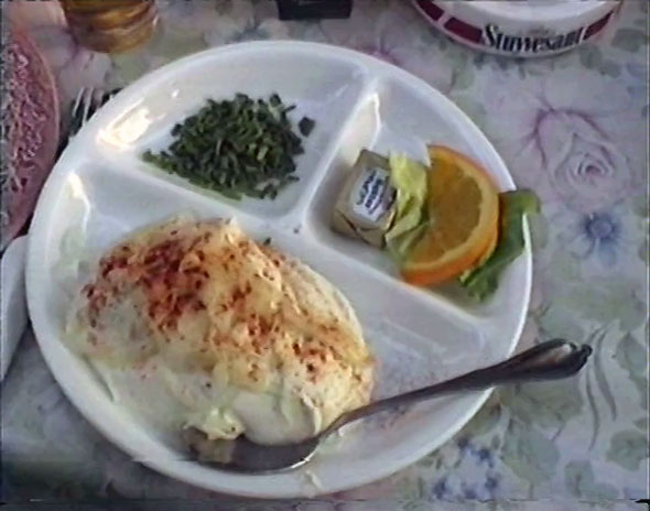 A frame from an old family video showing the extinct white cheese in August 1995